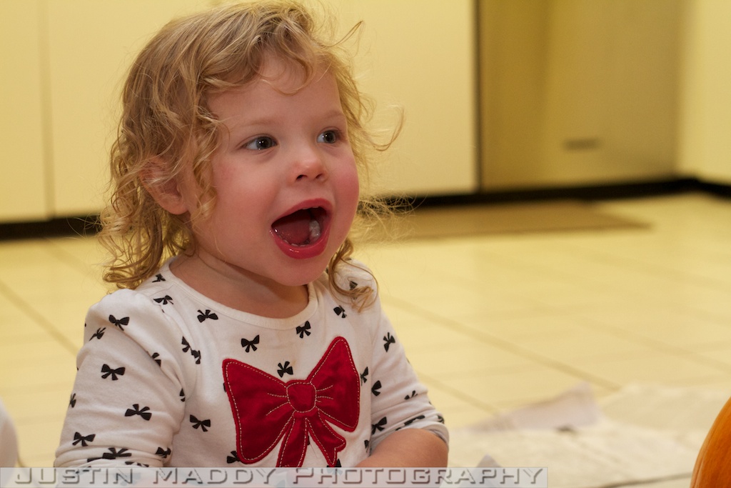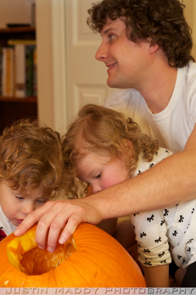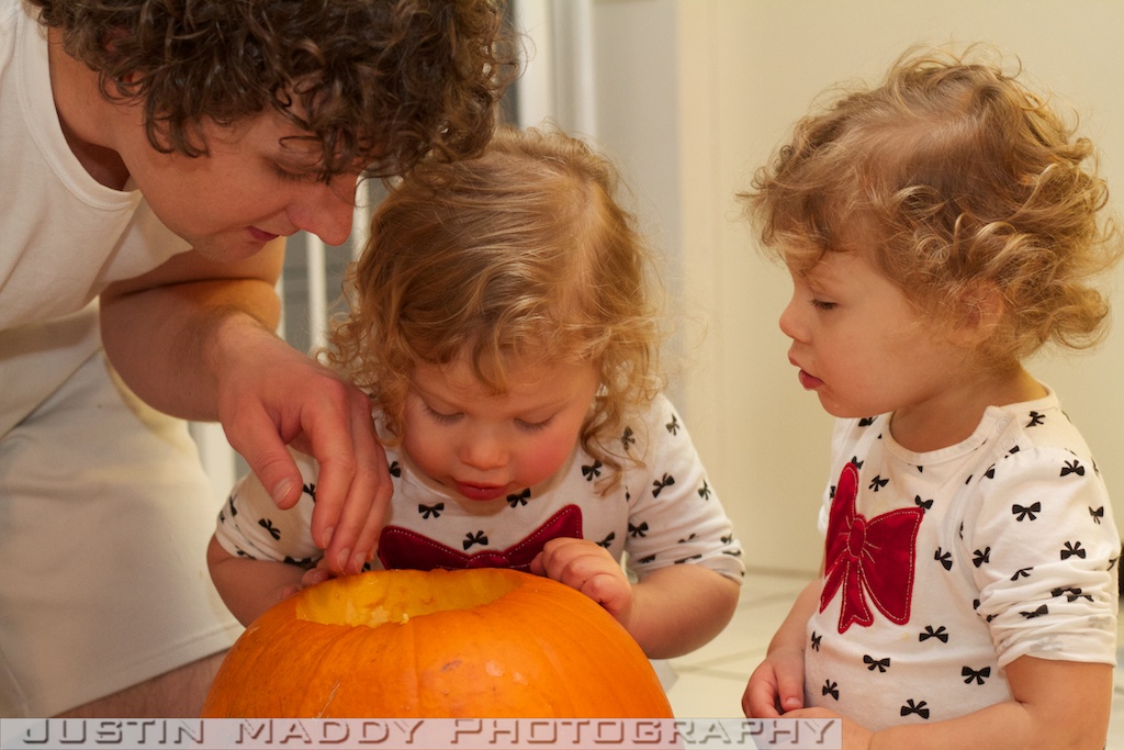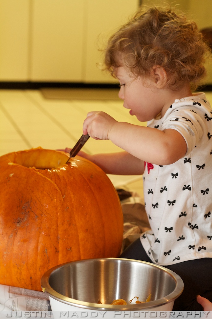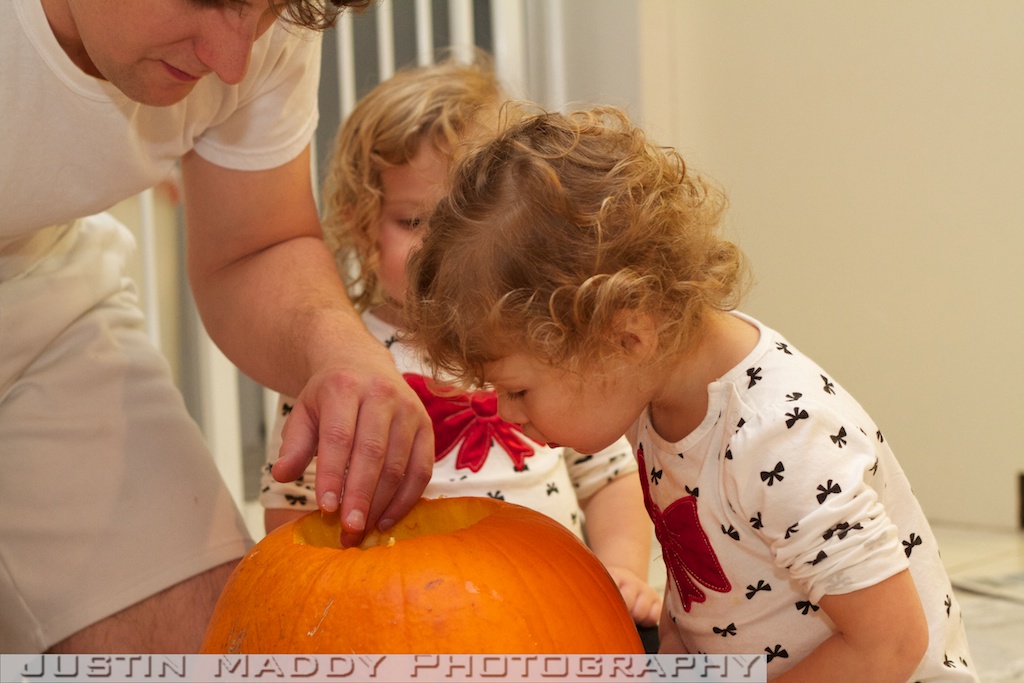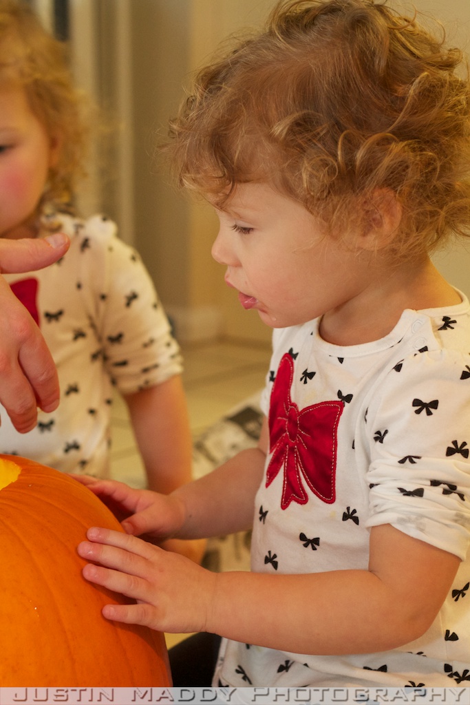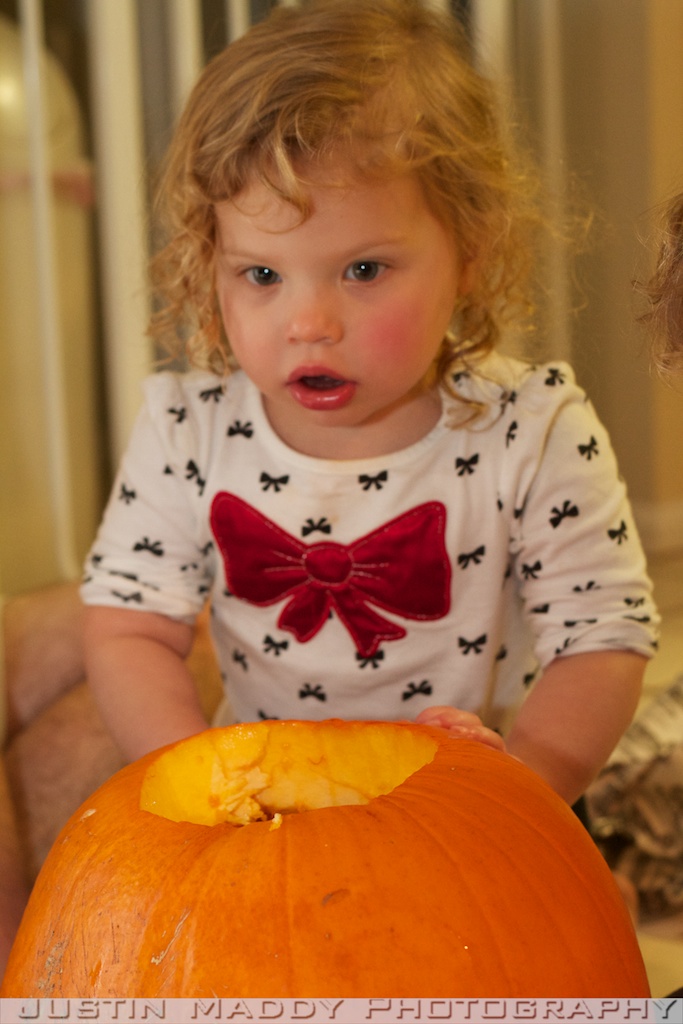 On the Monday before Halloween, we decided to carve the pumpkin to get the girls in the Halloween spirit. It was late already that evening since Justin worked late but he said it wouldn’t take long and he was right. The girls were already dressed in clothes that I didn’t care about getting messed up (you’ll see why as I remind you it is October still) so preparation took only a minute. Justin’s job was to carve while mine was to take pictures…easy enough! The girls were very much into it!