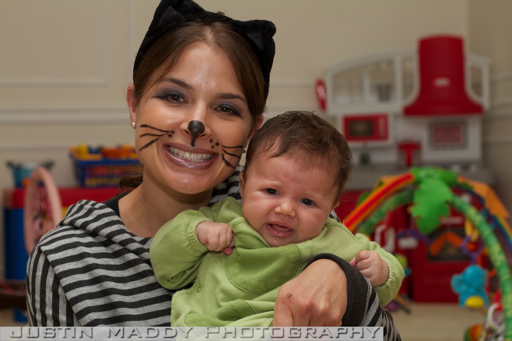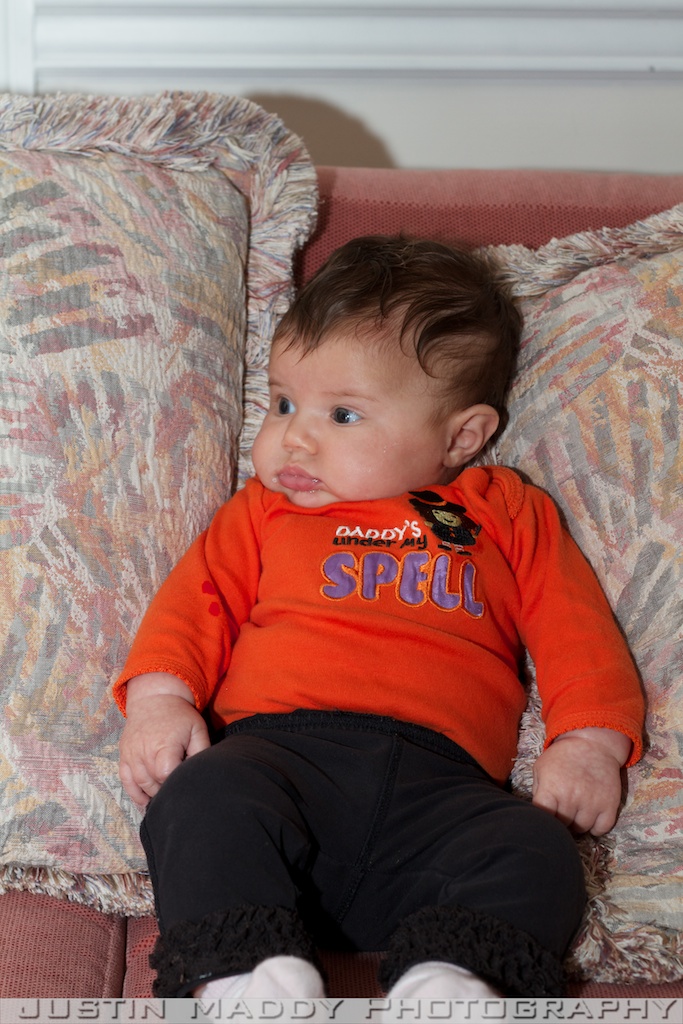She stayed home and gave out candy with Grandma and Grandpa while Mommy and Daddy took Avery and Emerson out trick or treating. When we got home we put her in a pea in the pod outfit (yes, the same one the girls wore and without the hat as I couldn’t find it).