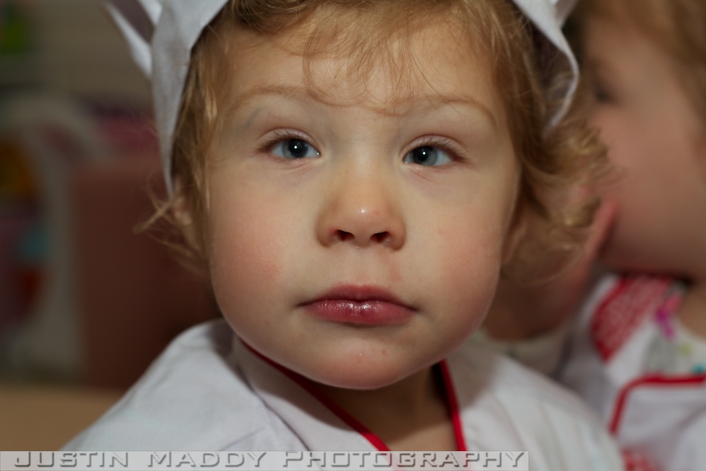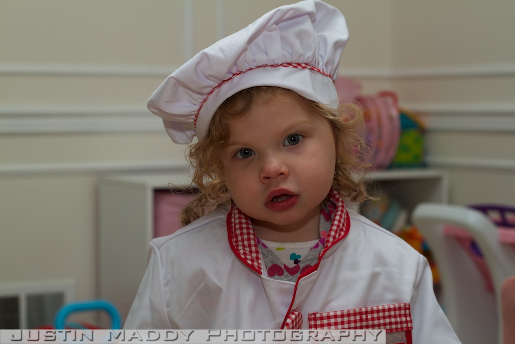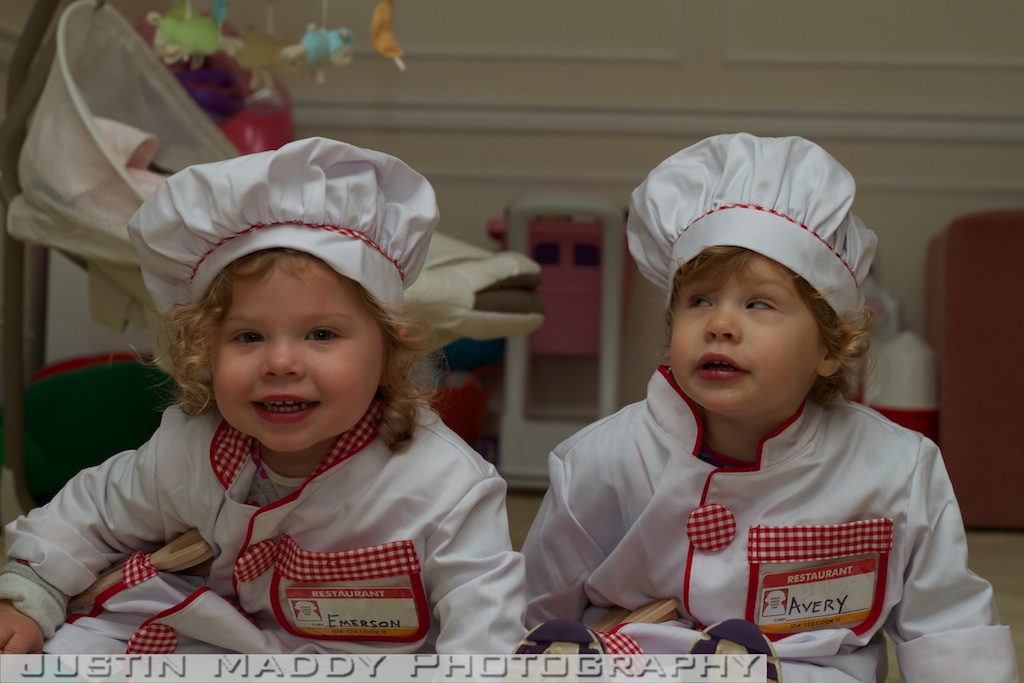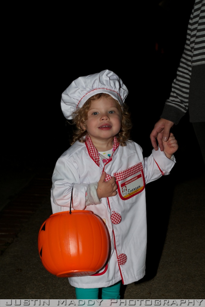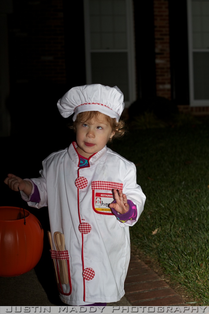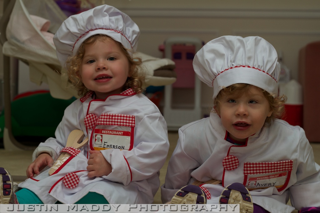 This year I had wanted the girls to be princesses for Halloween since they had received princess dress up costumes as a gift for their second birthday. While they love princesses, they don’t like putting on the princess outfits for some reason. I tried and tried but after several failed attempts, I realized they would have to go as something else. We even went out to Target one night and searched the Halloween costume aisle. The girls refused to try anything on. They have some sort of tag fetish and refuse to try anything on if it has a tag! We left the store with plastic pumpkins (which they loved) and a Mama that was wondering what in the heck I could have them dress up as that they would actually wear. I knew it had to be something they were into….thus the idea came that they were going to be chefs as they LOVE cooking and their play kitchen. Even when I prepare food in the kitchen these days, they immediately pull a chair right up so they can watch. So I bought two chef outfits online and they were the cutest little chefs in town.
