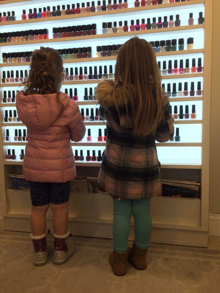 This is the second week that the girls have been off of school for winter break. For the second week, Justin and I are trying to do some special outings with the girls. This evening it was the older girls turn time with Mommy for mani/pedi’s. The girls picking out their polish (Avery rolled her pants up in the car in preparation for her pedi…and yes that is Emerson with straight hair!)