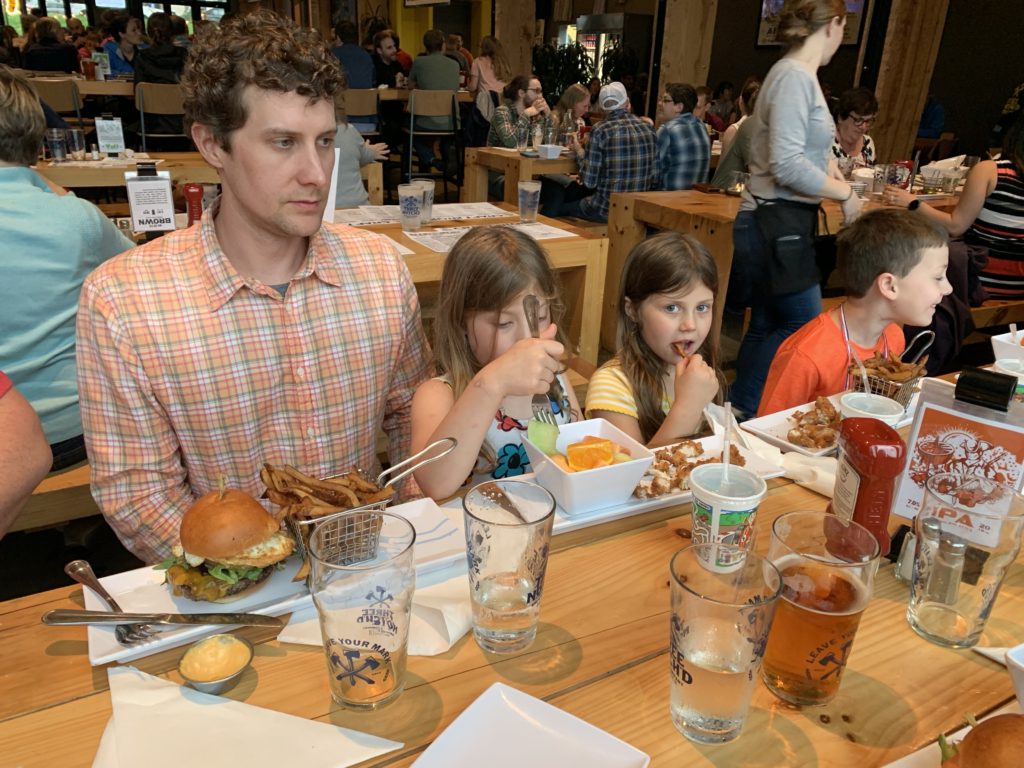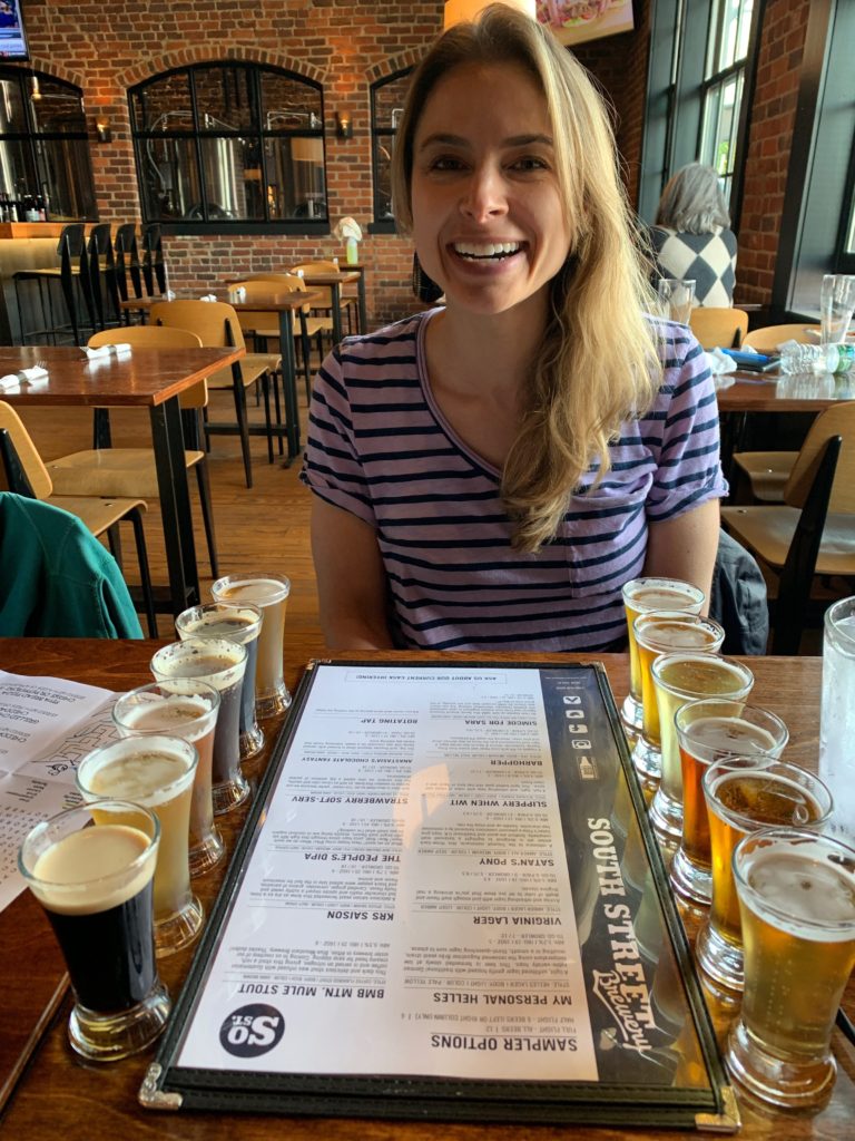 Thursday morning our 9:30 departure time, really turned into an almost 11:00 departure time! One day we (okay I) will be early for something….one day!! Despite getting up early, working out, and even finishing Lift 4, an 8 week-program, I was moody! Moodier than I have been in a month….the girls were not listening all morning and I let it get the best of me for some reason. The drive was quiet as we all had our IPADs and earphones. Yet the second we arrived in Charlottesville and at South Street Brewery, a flight of 12 beers seemed like just the thing I needed to turn my frown upside down.