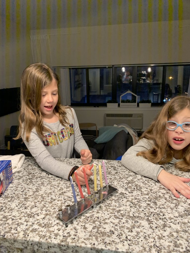 After dinner, we fake lit the menorah as we did every night in Philly. By fake lighting it, Harper actually participated.