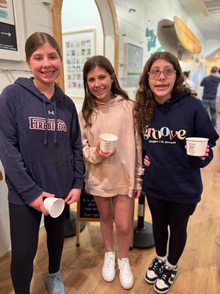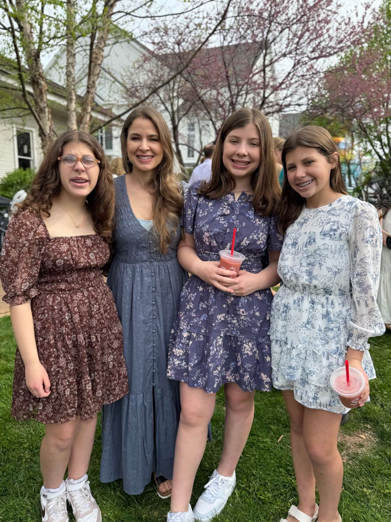 We enjoyed the free treats and warm weather on the Town Green. It was a beautiful day and I was so happy that the outfits that the girls wanted to wear all coordinated with one another. Once I knew what they were wearing I pulled out my blue dress to maintain the look! And Justin and I always seem to wear the same colors so he blended in very nicely too!