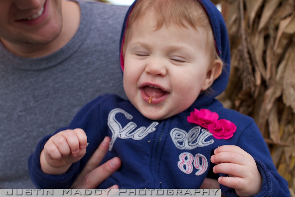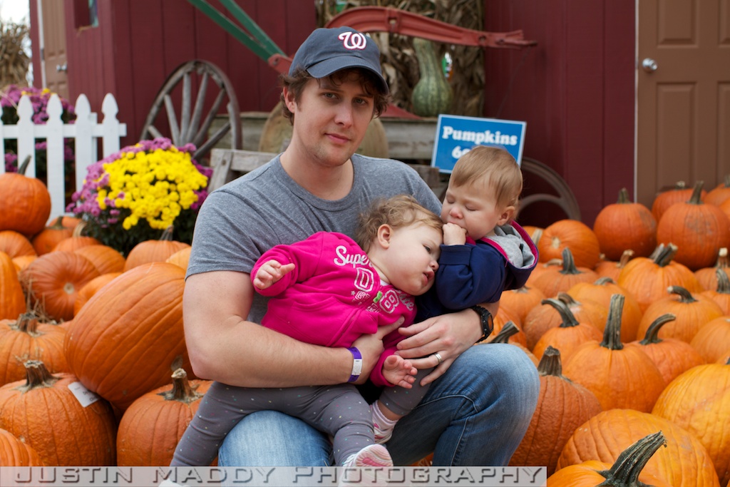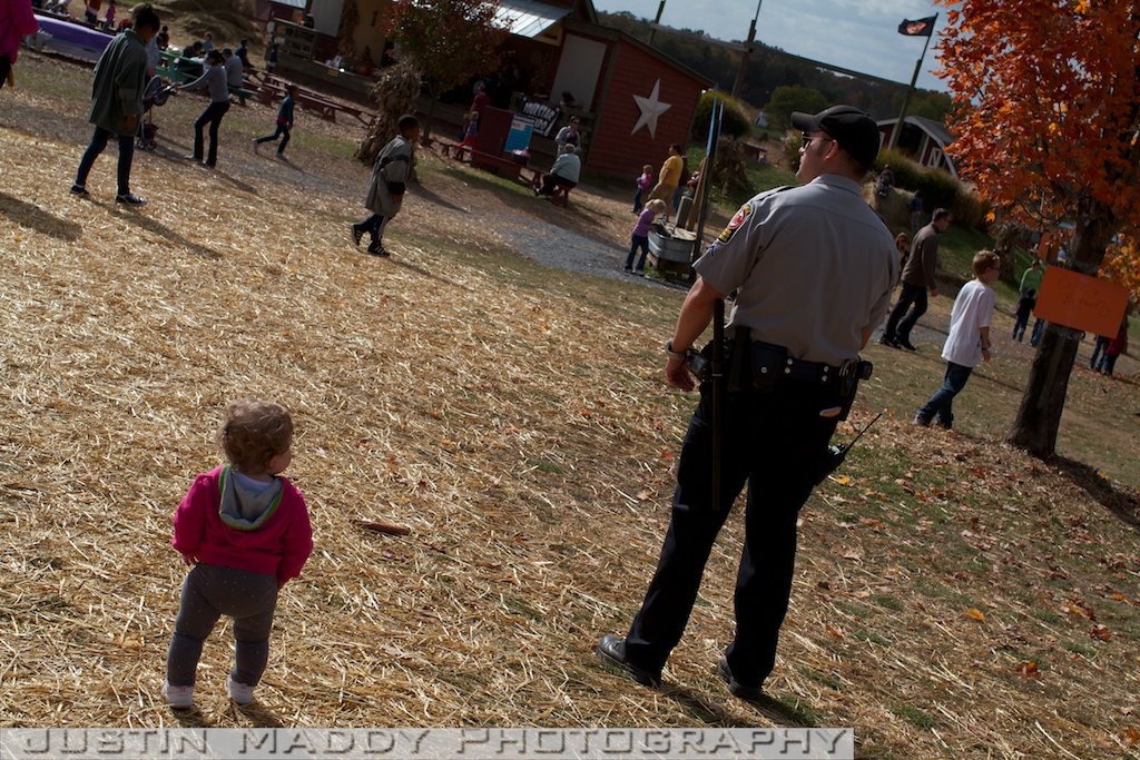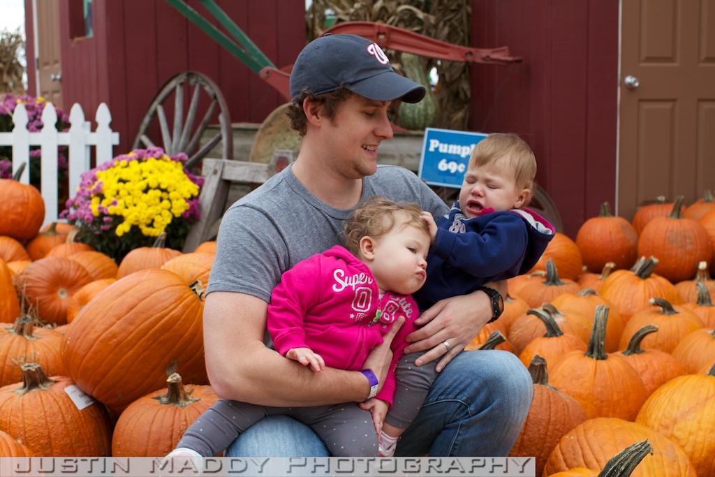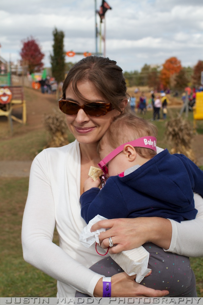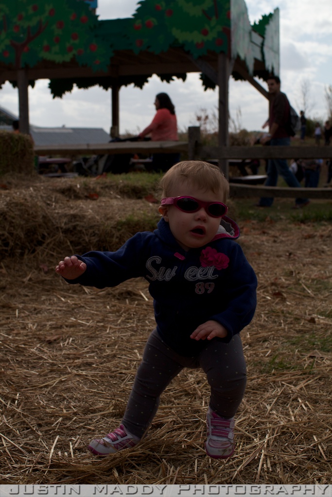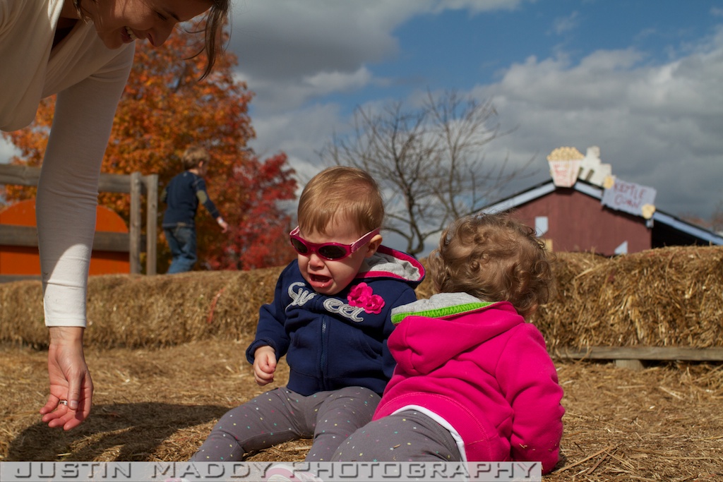 This past Saturday we took the girls to Cox’s Farm Fall Festival. It was a beautiful fall day, temperature perfect…warm in the sun and more importantly warm enough for no coat! We let the girls get out of their stroller and walk around. Emerson loved it; Avery not so much. She took a few steps when we first got there, but then she cried off on and on the entire time. When she was out of the stroller, she would cling to me or Justin for dear life. Sometimes big events such as these that are out of the every day norm are sensory overload for her. Still when she cries, I can’t help to laugh sometimes. I know that is awful as a mom but she seriously has the CUTEST pouty lip that I have EVER seen! Emerson on the other hand was LOVING the freedom that those chunky little legs of her give her. She had a great time checking everyone and everything out and loved climbing on the hay!