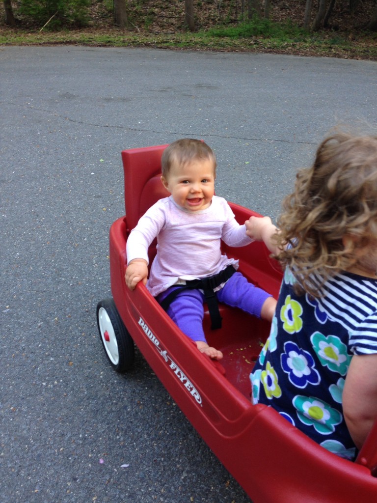 It’s been two weeks and we are getting settled in and coming up with our new routines.  The adjustment for the girls has been pretty seamless.  They love their new home.  We only had one moment where Emerson told us she liked Papa’s house and not this house…her reasoning was that there was no park in the neighborhood.  We have gone on a few walks on the weekend and a few evening strolls and have had a chance to meet some neighbors.  The neighborhood is very friendly.  Harper even got to ride in the wagon for the first time and she LOVED every minute of it.
