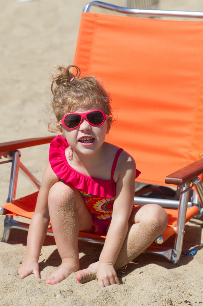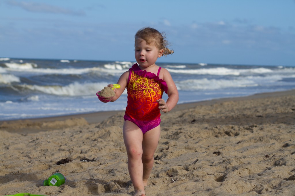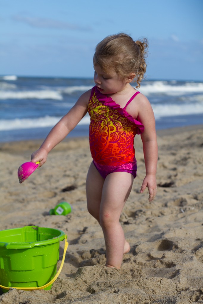 After lunch and a quick nap, the plan was to head to the pool. However, I had gone for a walk with Harper as she napped in the stroller and then sat on the beach by MYSELF for a half hour as the girls still slept and the beach was literally a different beach than it had been earlier the week…the wind had stopped, it was actually hot, and the ocean was calm. We had to visit the beach one last time so we made a quick stop there before heading to the pool. Avery and Emerson still wanted nothing to do with the water, but they enjoyed playing in the sand. Harper on the other hand had no fear of the water.