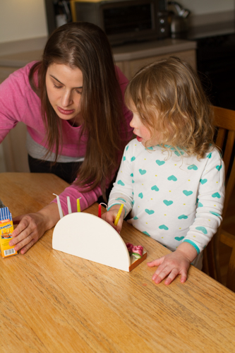 For eight nights the girls lit their menorahs and said the blessings. Emerson and Avery say the blessing clearly and can even say portions of it on their own. Honestly, I’m so impressed with how well they say the blessing and I wouldn’t be surprised if next year they say the whole thing from beginning to end all on their own. The first night of Hanukkah we celebrated at Grandma and Grandpa’s house with my mom’s famous latkes. After lighting the menorah, Emerson blew her candles out! She thought they were like birthday candles and was embarrassed upon realizing what she did. The girls were spoiled by my parents as my mom got the girls presents for every night of Hanukkah. Justin and I are a little simpler and while the girls did have something to open every night (from at least someone), the majority of the girls gifts were fairly simplistic (i.e. simple arts and crafts) or a necessity (sneakers and boots as they each only have one pair of closed shoes that currently fits them). The girls are at an age where they are truly appreciative of anything and everything that is a gift.