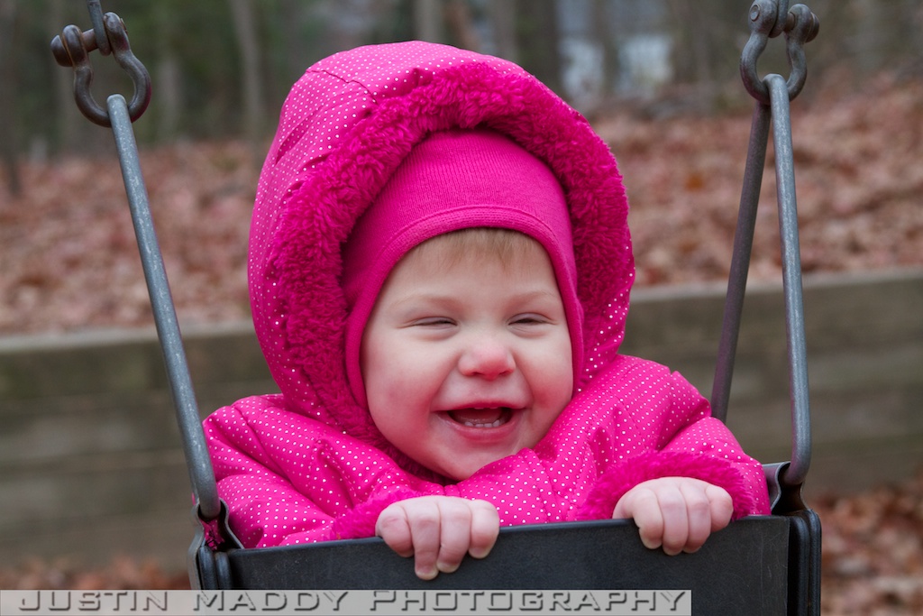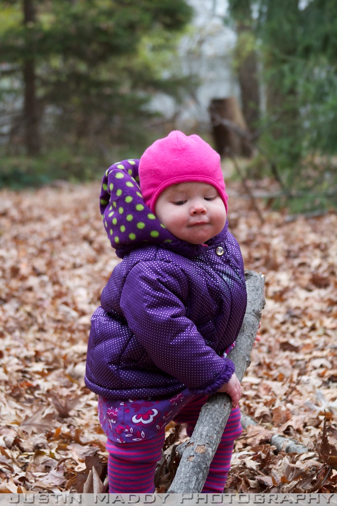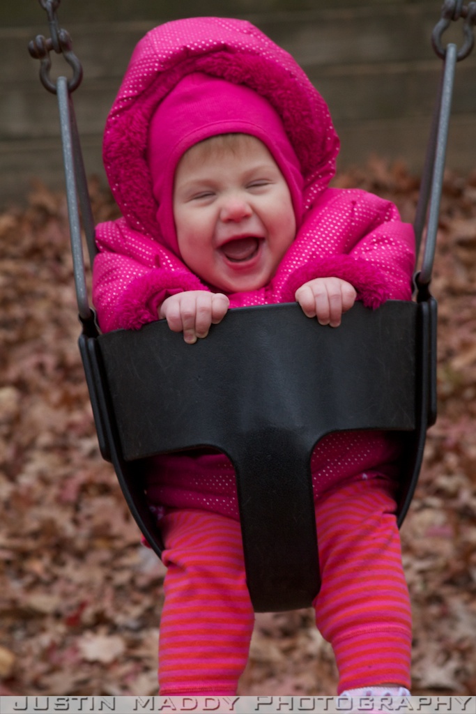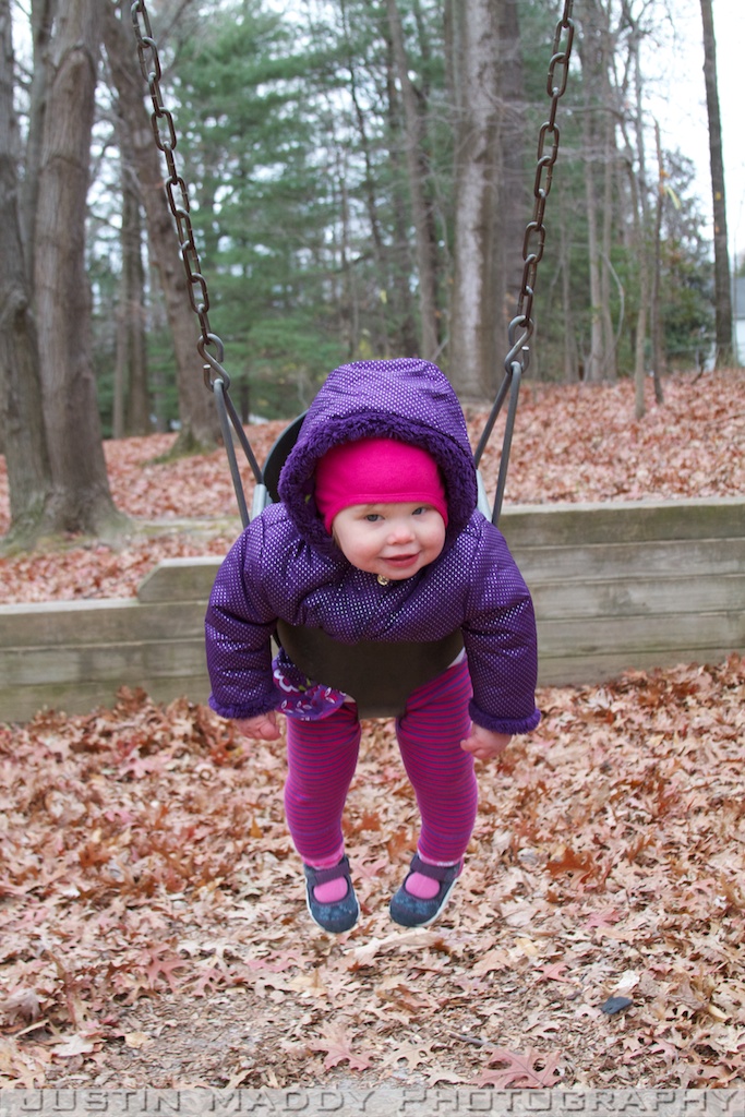 We decided we would have better luck if we only featured the girls on the holiday card. Odds of having two people look good vice four were much better. So we took the girls to Glyndon Park and had them run around in the leaves and play on the swings. The leaves were a little scary to Avery but once she was in the swings she was having a blast. Emerson had us cracking up because she was picking up logs and trying to move them.