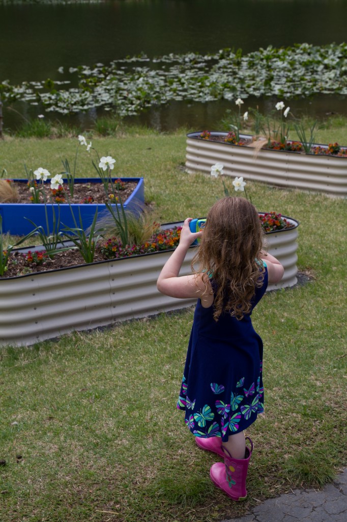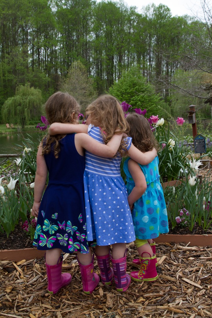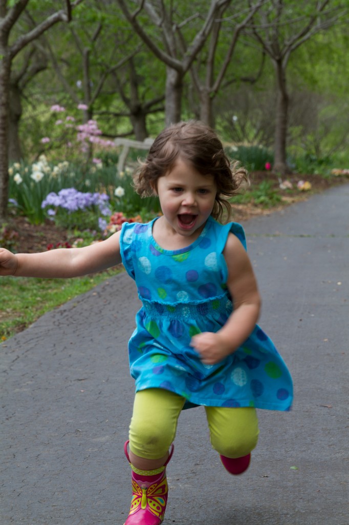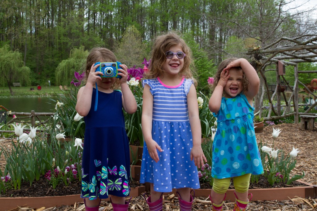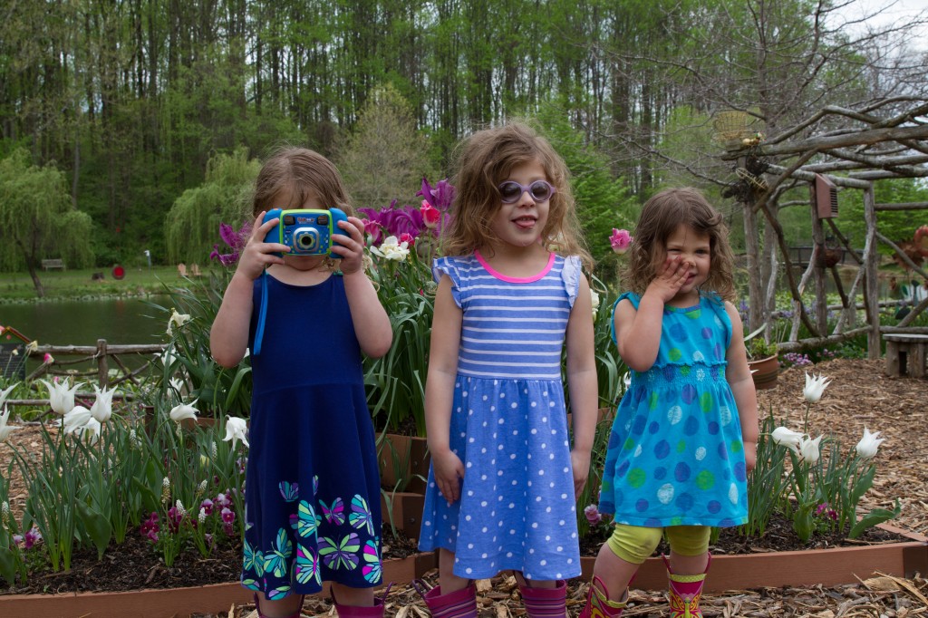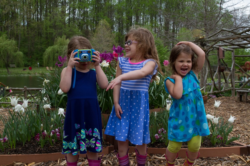 Playing in the tea garden and attempting to get them all in the same picture (playing a game of who is taller)