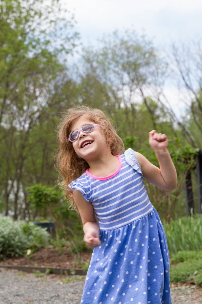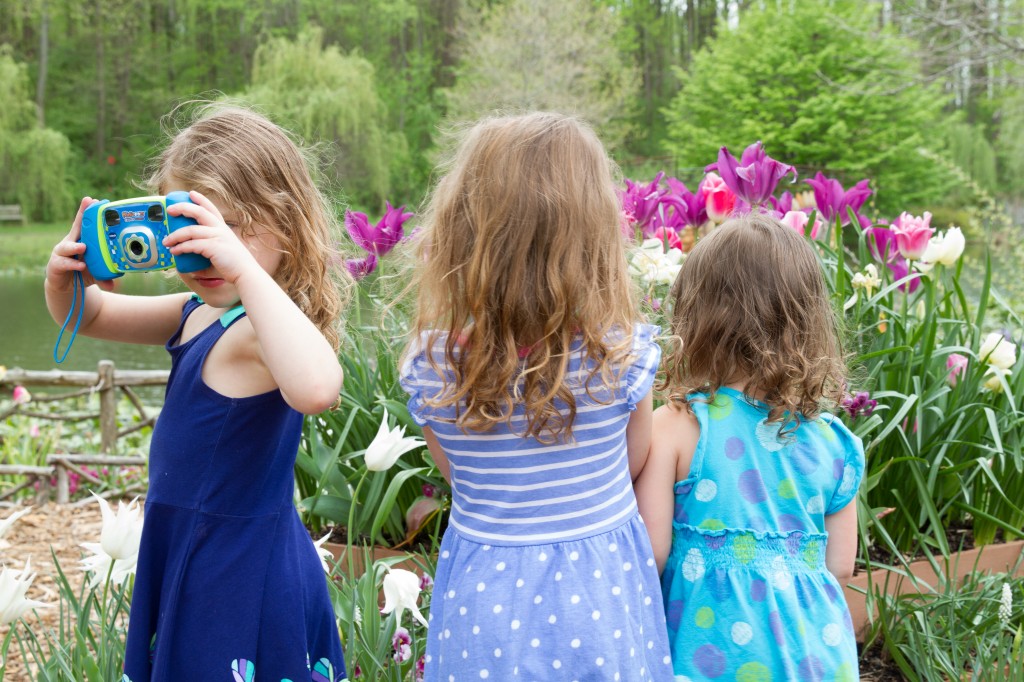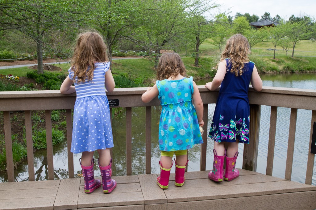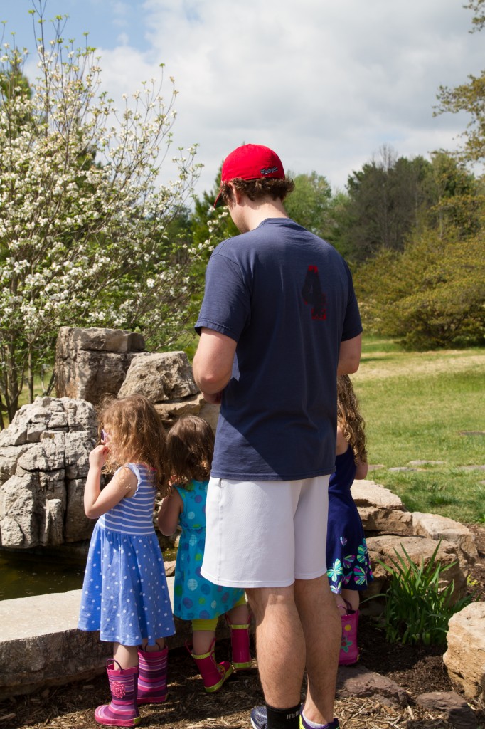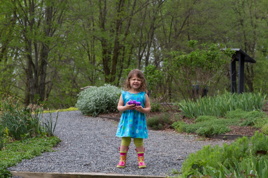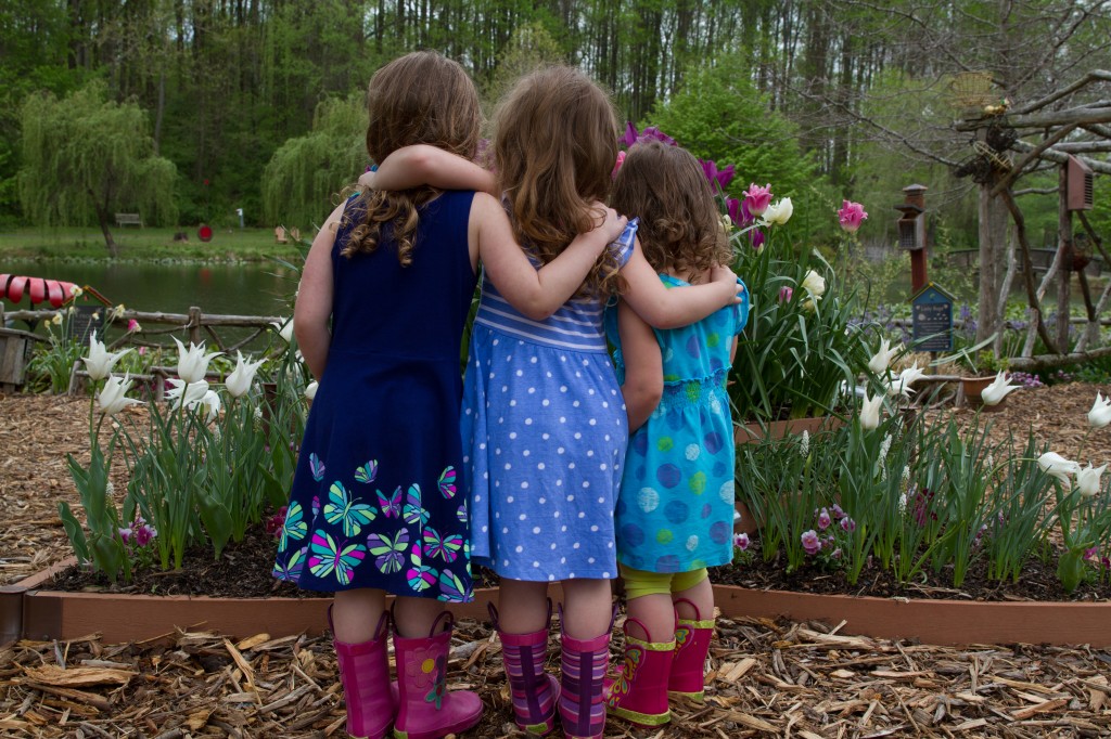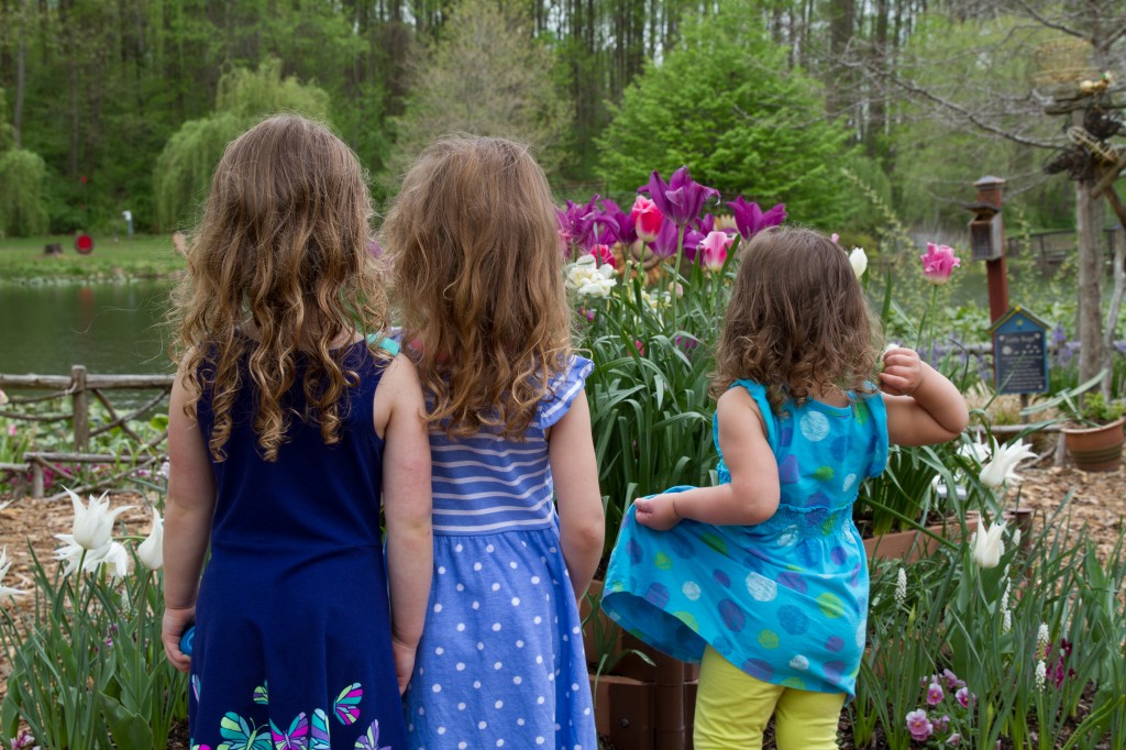 Playing in the tea garden and attempting to get them all in the same picture (playing a game of who is taller)