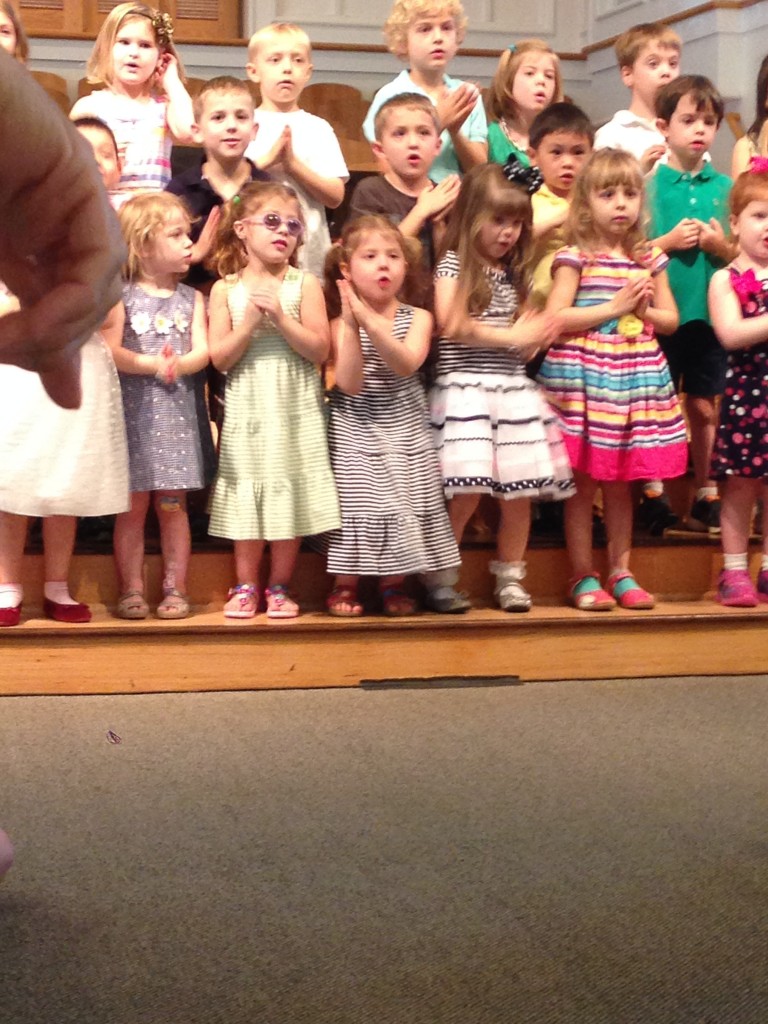 The last day of the school the girls had their end of the year concert. They had been rehearsing their songs at home some and while they knew all the songs, I was a little nervous that they would have some stage fright. The girls stood next to each other center stage and they were awesome…they were loud, knew their words, and had good accompanying hand and body movements. Seriously, I was so proud of them….they did awesome. And we have it documented forever! (Last week Justin and I bought a video camera….as much as we love photographs, I wanted to have their little voices and funny sayings and special moments on video. My long term goal is to put together a video highlight each year so that the videos are actually watched in years to come).
