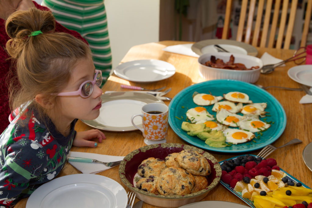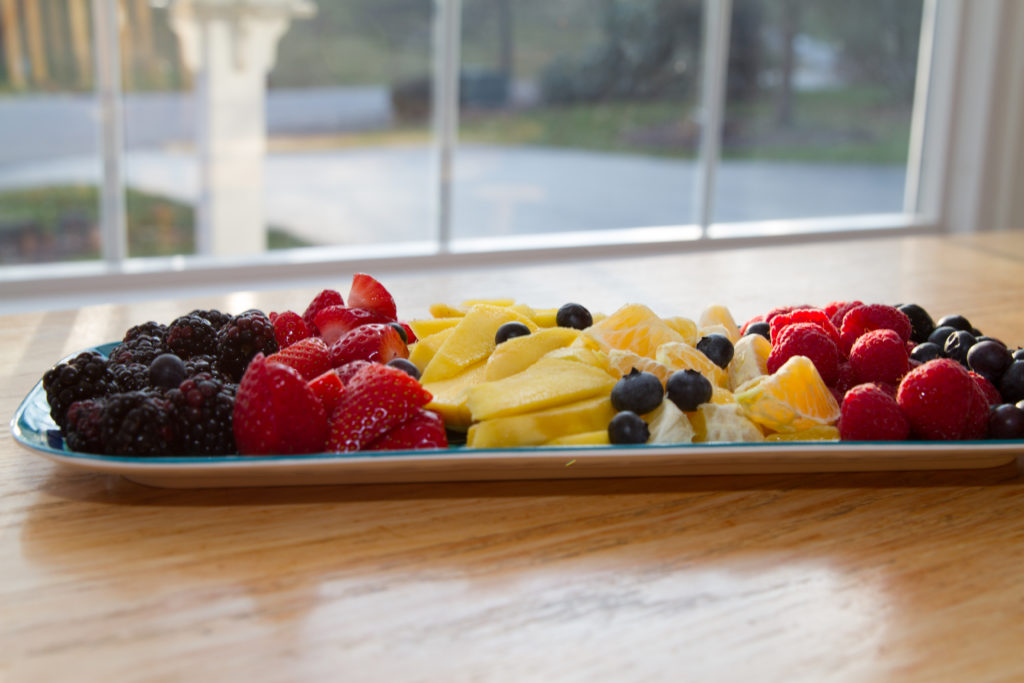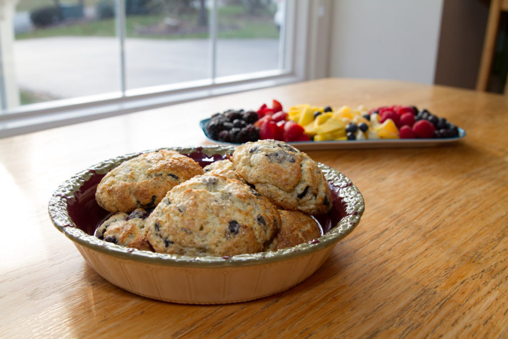 Then it was breakfast time! I did most the preparation of breakfast the evening before so that I could enjoy the morning as much as possible while still eating breakfast at a relatively decent time. Breakfast smelled delicious and was equally amazing! Homemade blueberry scones, thick Applewood smoked bacon, fried eggs with chives and avocado, and a beautiful fruit platter.