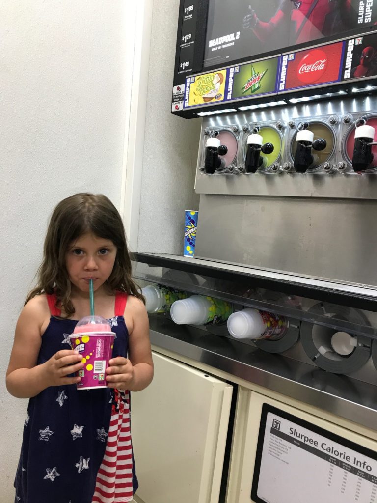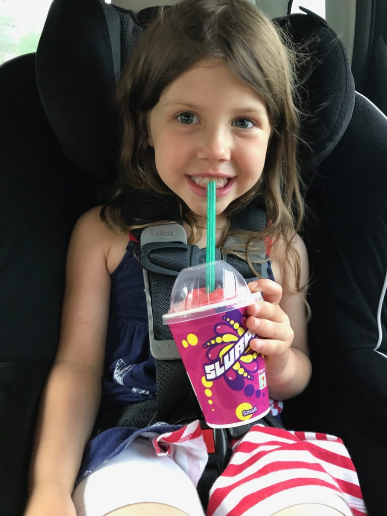 I decided to spice it up a little bit and actually take her to 7-11 to get her first slurpee, and I found myself giving her a tour of the place like it was an Open House. It reminded me of all the times I had gone in to 7-11 with my own mom and dad as a kid (we did it all the time). We had a to do a few errands after that, but she proudly drank her slurpee everywhere we went. When I showed her the spoon at the end of the straw – you would have thought I had dropped a unicorn in her lap, she was super shocked and excited.