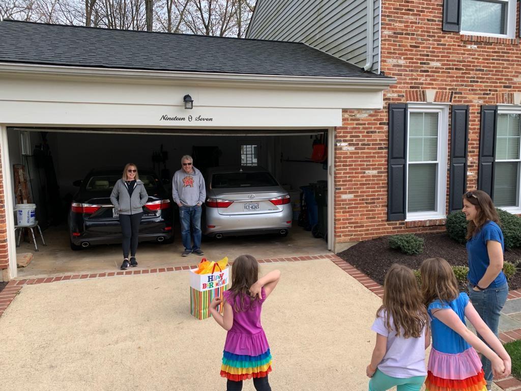 We “shared” a bottle of wine by bringing our own wine glasses and having a no-touch pour in the middle of the driveway. The girls decorated the driveway.