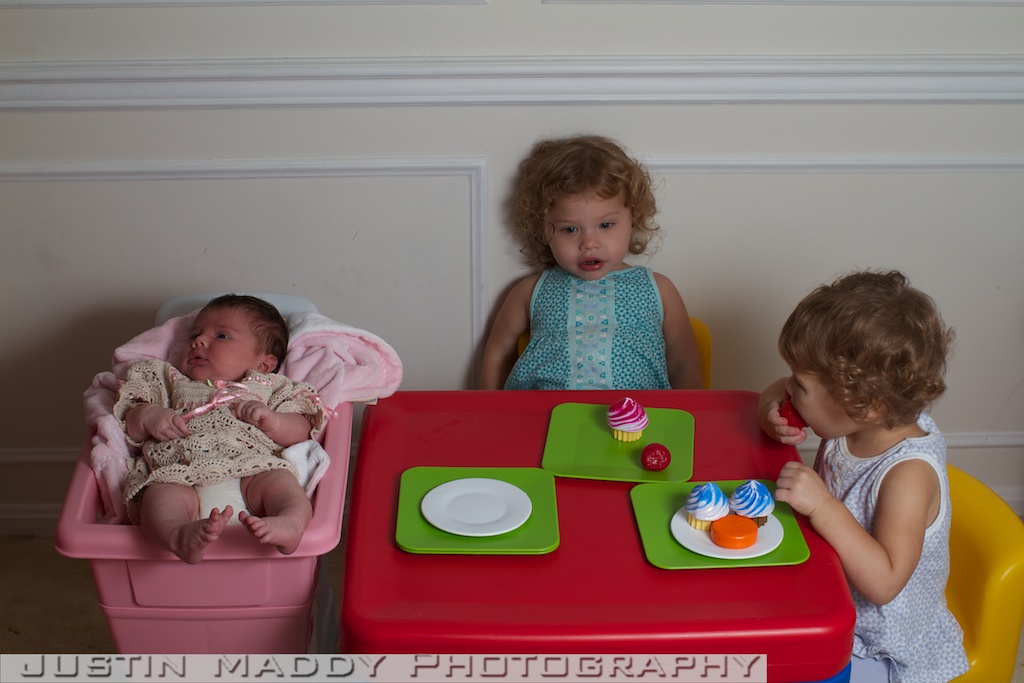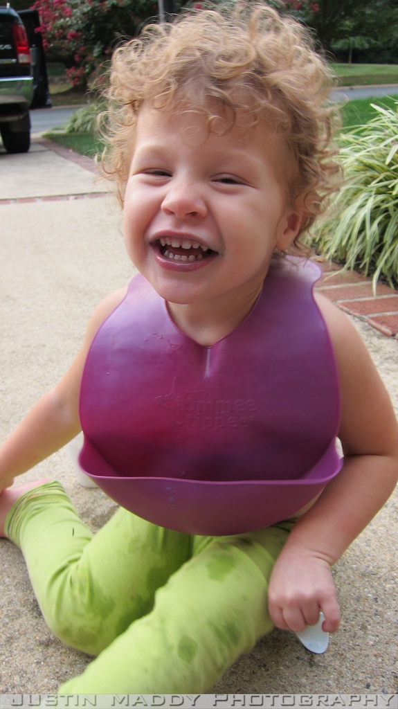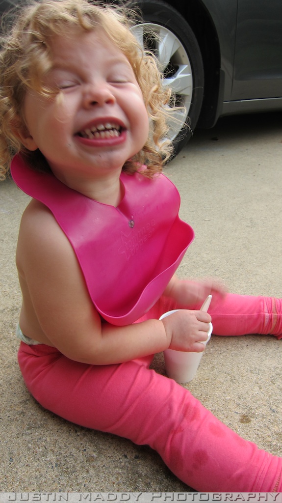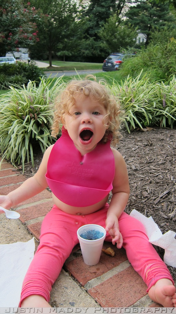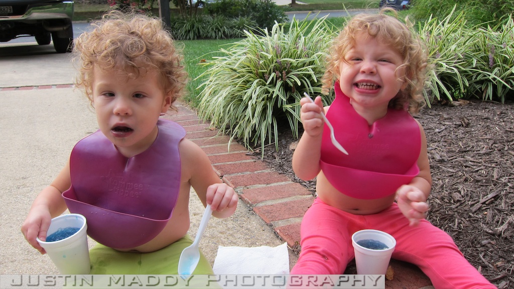 These pictures crack me up especially of Emerson. First of all Avery and Emerson had just had a bath and Ana parted Emerson’s hair on the right side which I think looks odd on her. Secondly, she wouldn’t smile which is quite contrary to her typical cheese face that she displays the majority of time for pictures. The night before my parent’s had their pool closed and while the two men were closing the pool, the ice cream man came by and one of the men bought the girls shaved ice. It was practically melted before they started and it was blue. What was I to do but to quickly strip their shirts off, put on a bib, and let them dig in.