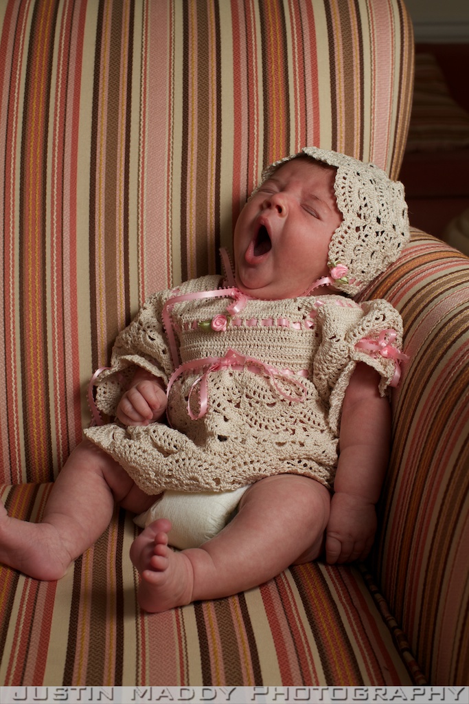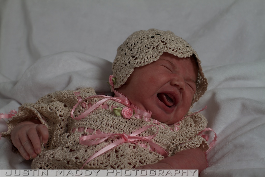 Almost 2 weeks old wearing a beautiful outfit and bonnet made by Gigi’s cousin Joyce.