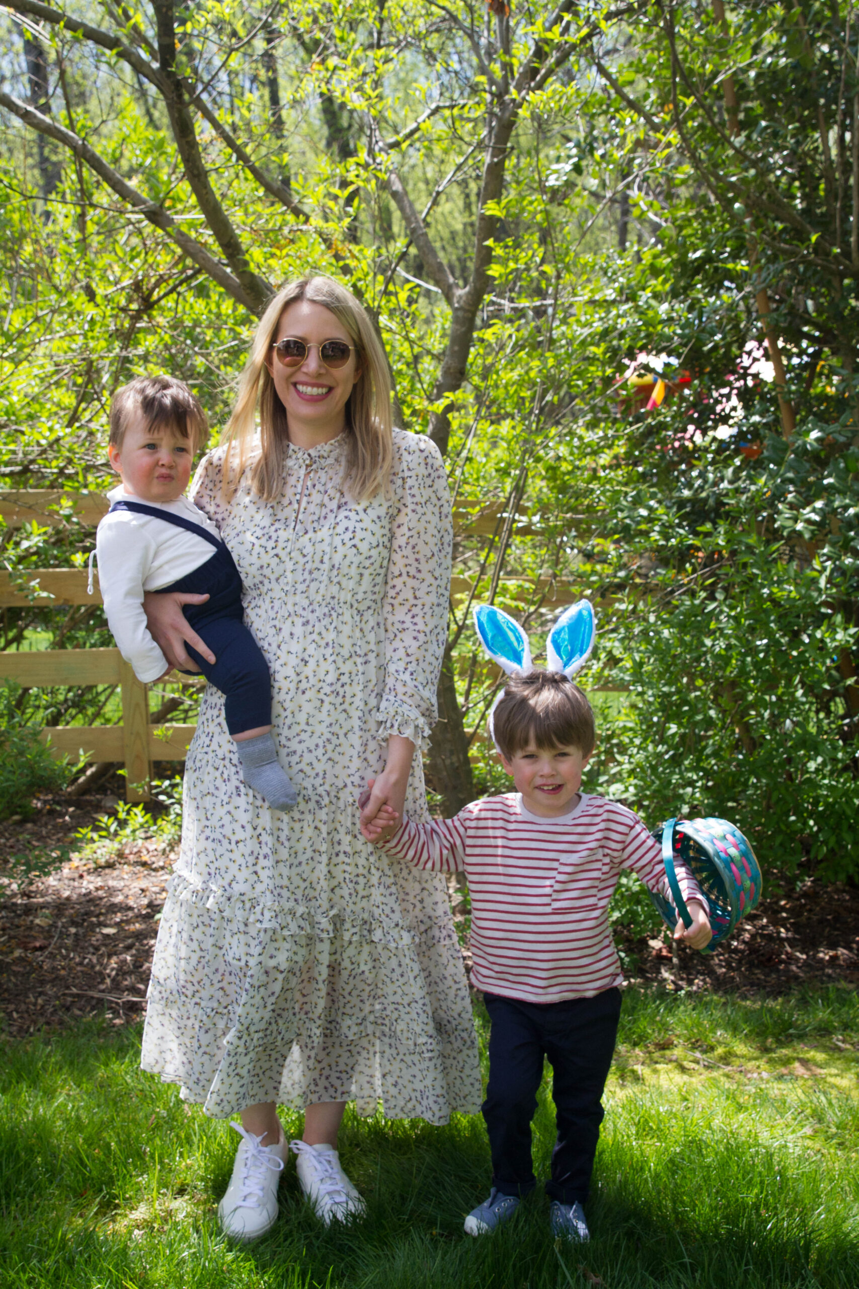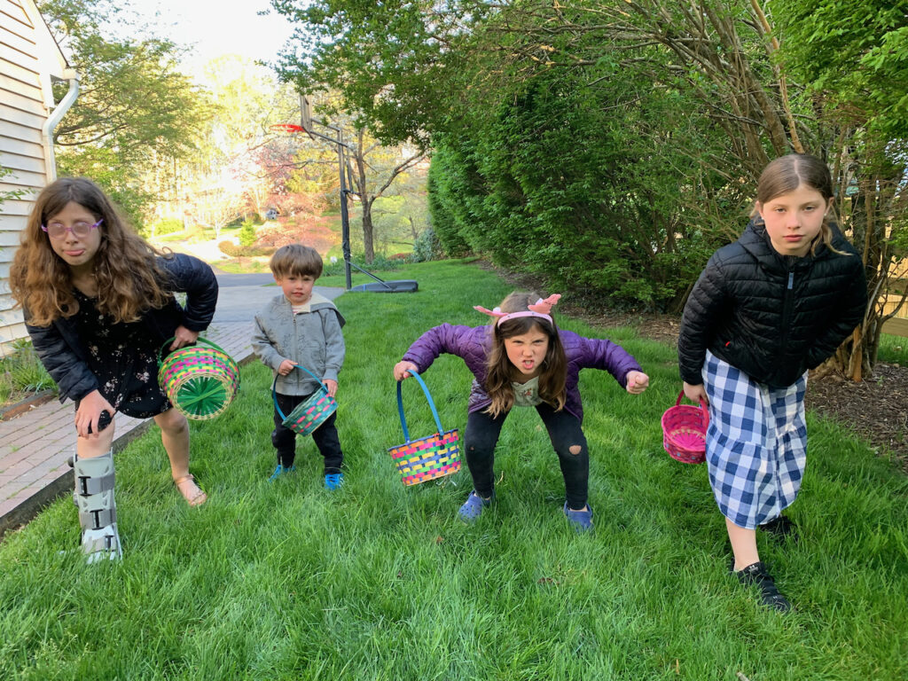 My parents, sister, and the boys arrived around lunchtime, and we had our first Easter Egg Hunt. We modified the color scheme that we normally do as we didn’t think a 3.5-year-old would grasp the concept of only picking up select colors. Anyone could pick any eggs they found up to a certain number in which they had to wait for everyone to get that number before running off for the next round. Avery re-injured her foot during one of the last races.