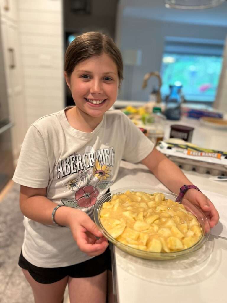 Harper – Harper decided to ask Bob for the Norwegian Apple Pie recipe that came from his stepmom. Harper devoured it when Bob and Cindy brought it over last year. She also made it with Bob and Cindy last year as part of her Baptism gift. The recipe was simple; the dessert absolutely gorgeous coming out of the oven with the sugar and cinnamon topping.