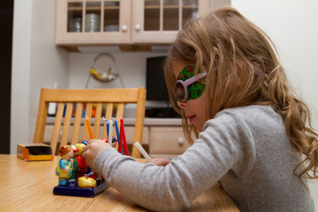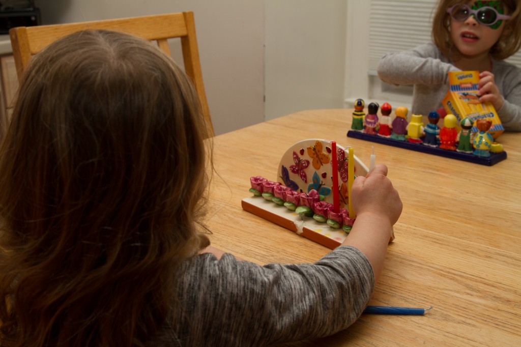 Emerson placing her candles in her menorah. As you can see, her menorah was one of the ones that fell and broke last year and Justin managed to glue it back together to somewhat salvage it.