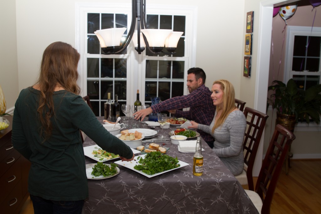 My mom suggested we order platters, but that’s not my style. So while we did order two cakes, I did everything else myself….I stuck to an Italian theme….did one baked ziti, one pasta with pesto, peas, squash, prosciutto, and mozzarella. Then I did a caesar salad with homemade croutons and a kale salad with toasted pine nuts, cranberries, and a lemon mustard vinaigrette. I also did my famous “chicken balls”….meatballs but with ground chicken. All was delicious and I definitely saw most everyone go back for seconds. Everything about the night was perfect….we are finally learning to host in our home…i.e. finding the best place to put the drinks, the trashcan, etc….all may seem little but placement is huge in a successful party!