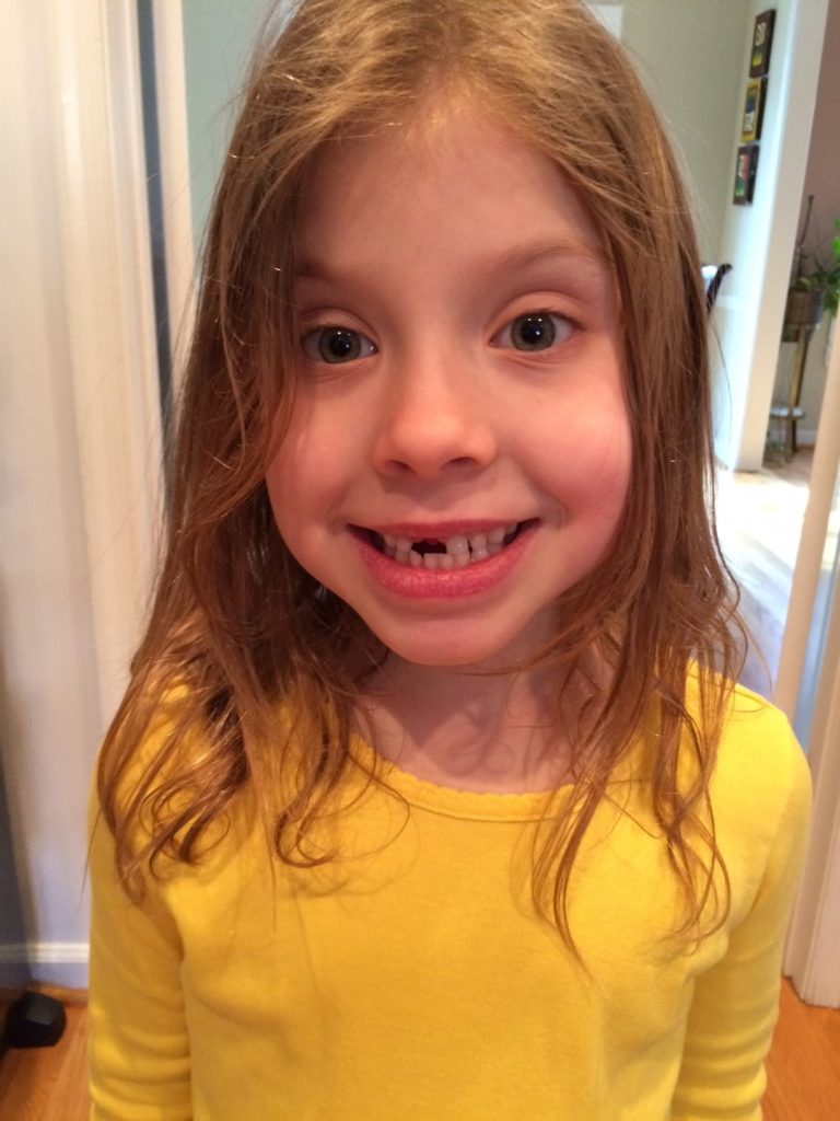 My Emerson finally lost a tooth! Avery has already lost five and I’m pretty sure Emerson is the last kid in her class to lose a tooth. While we kept telling her that all kids lose teeth at different rates, I think she was feeling left out. So imagine her excitement last night when her tooth became loose to the point of realistically losing it in the near future. She couldn’t keep her hands from wiggling it. She was determined to pull that thing out! Her wishes came true and by the end of the school day today just after she finished talking to Mrs. Peters about her loose tooth, it fell out. Seriously, her excitement permeated the house all evening. It was amazing to see her so happy.
